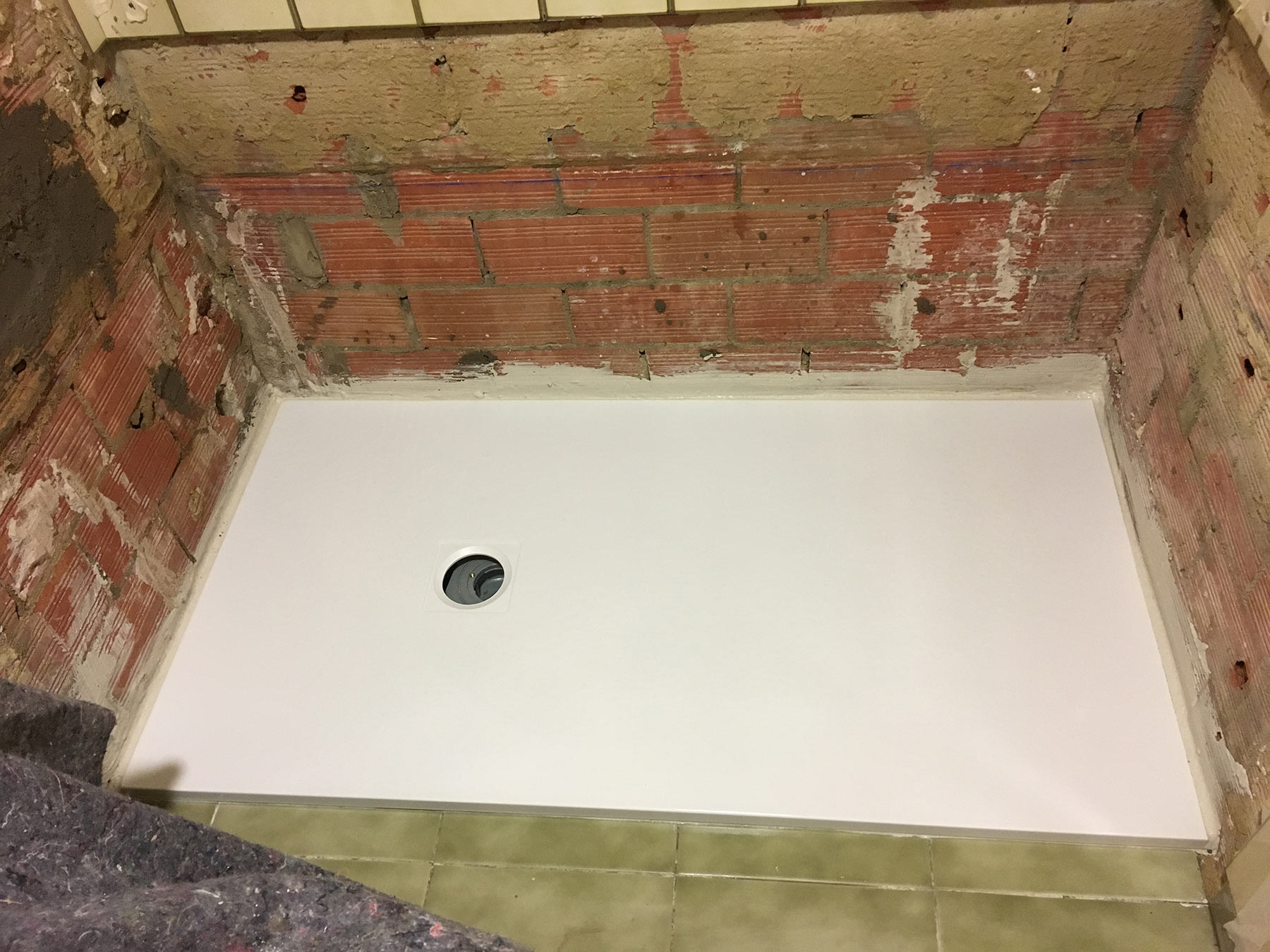 Los primero pasos a dar es preparar la zona de trabajo y protección de dicha zona así como elementos susceptibles de ser dañados. Seguidamente se realiza el desescombrado de la zona a tratar. Se modifican los puntos de agua en el caso de que sea necesario para la correcta conexión del grifo de ducha. Se prepara la zona de evacuación para el plato de ducha y la base, una vez preparada dicha zona se procede a la colocación del plato de ducha, el cual puede ser de varios materiales y varios acabados.