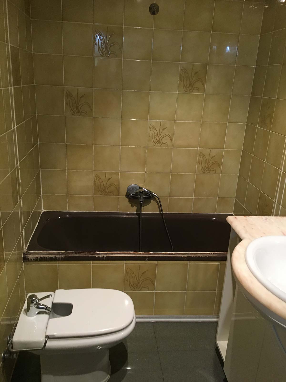 Para la anulación del bidé, hemos utilizado 2 piezas de revestimiento recuperadas del desescombrado para tapar las salidas de agua y una pieza de pavimento proporcionada por el cliente para tapar la salida de evacuación.