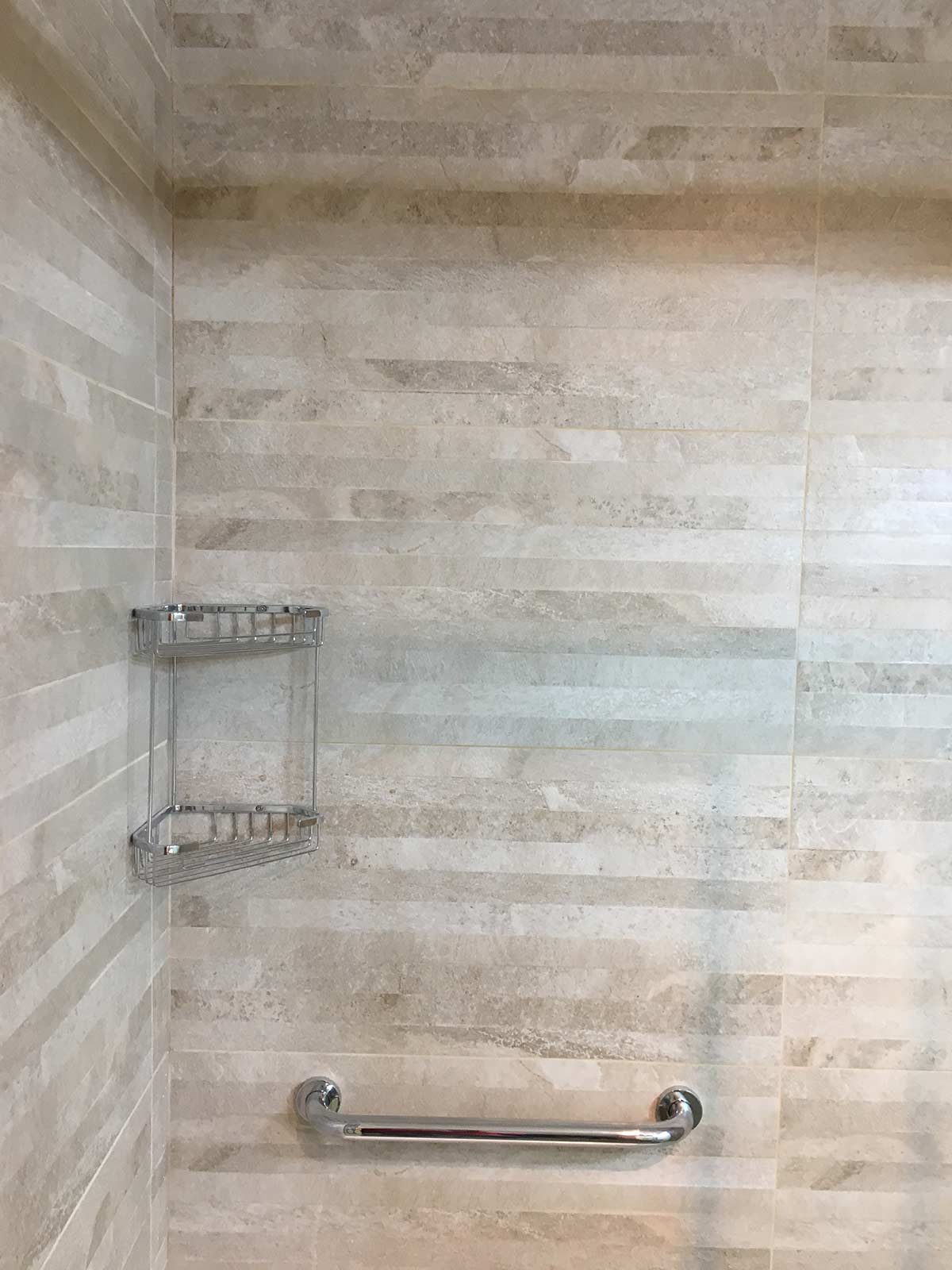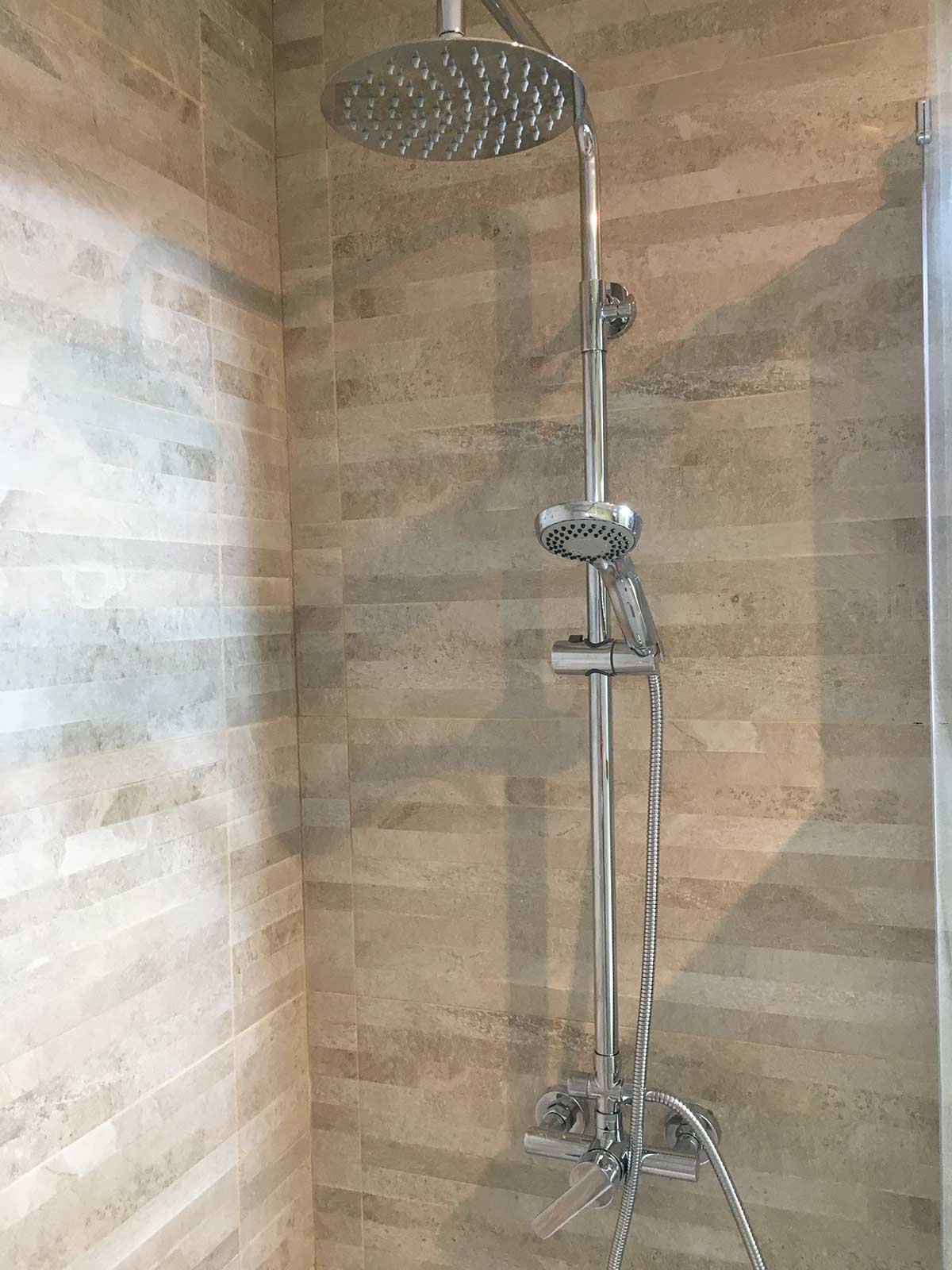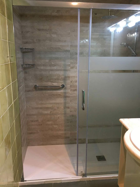 Por ultimo instalamos todos los accesorios, cestillo de dos alturas inoxidable, asa de seguridad de 30 y conjunto de ducha. La mampara es de dos hojas (fija + corredera) con cristal templado decorado y antical, de 8 mm la parte fija y 6 mm la corredera. No lleva perfilería inferior para así tener menos altura al pasar.