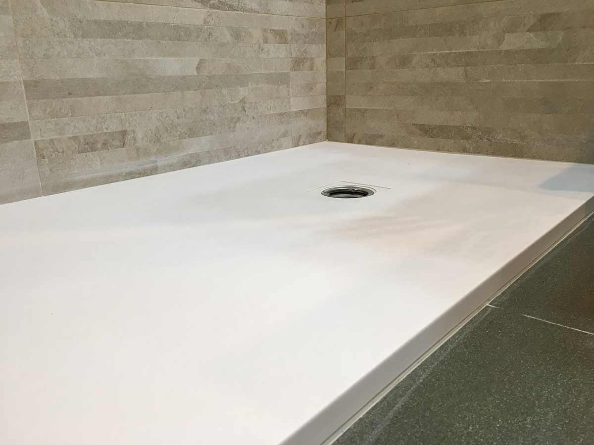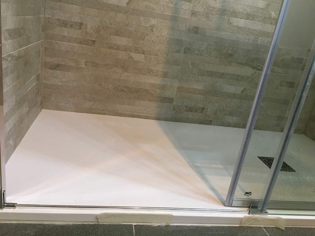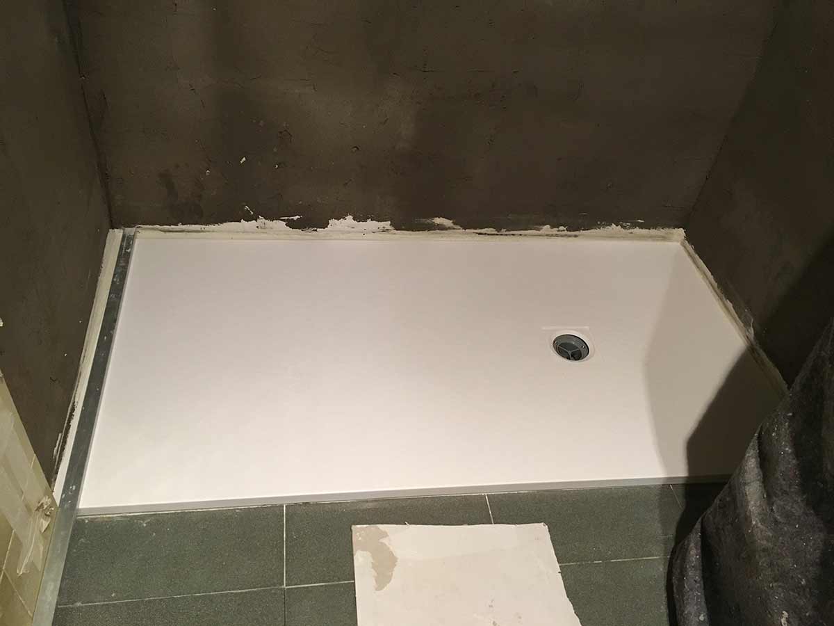 El siguiente paso es preparar la evacuación del plato y la base. El plato que se coloca es de carga mineral (polvo de mármol mas resinas) con antideslizante grado 3 que es el máximo que hasta ahora se le puede dar.