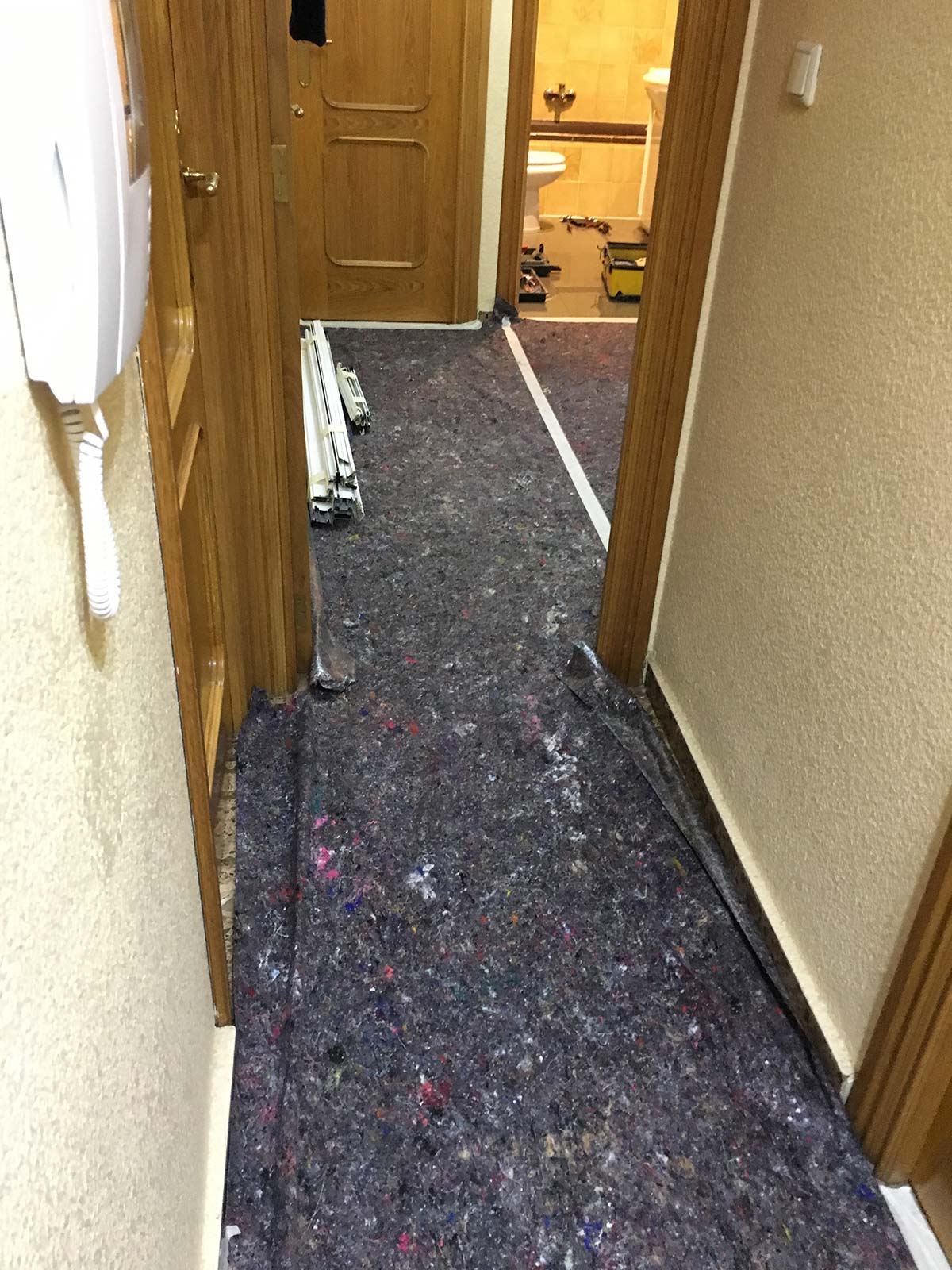 Procedemos en primer lugar a proteger toda la zona de paso de materiales así como los elementos alrededor de la zona de ducha. Seguidamente realizamos el desescombrado de toda la zona de ducha y la anulación del bidé ya que los clientes, con movilidad reducida, necesitan el mas amplio paso de entrada.