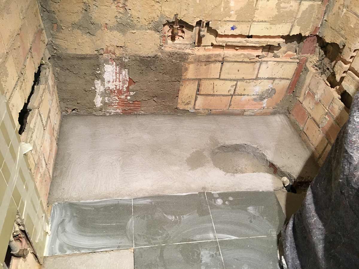 Realizamos en este caso un cambio de los puntos de fontanería en altura y lado de pared. La fontanería la realizamos en cobre del 18. Seguidamente maestreamos las paredes y las dejamos preparadas para alicatar.