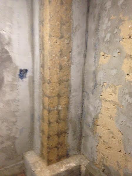 Realizamos un cambio de posición en los puntos de fontanería para adaptarlo a la nueva distribución. Seguidamente maestreamos las paredes y las dejamos preparadas para alicatar. Previamente hemos realizado las regatas correspondientes en los puntos eléctricos necesarios. En el desescombrado descubrimos que la pared medianera frontal no esta trabada y esta medio suelta. En este caso procedemos a reforzar las esquinas y a amarrar la pared con malla, de esta manera y una vez alicatado se quedara firme.