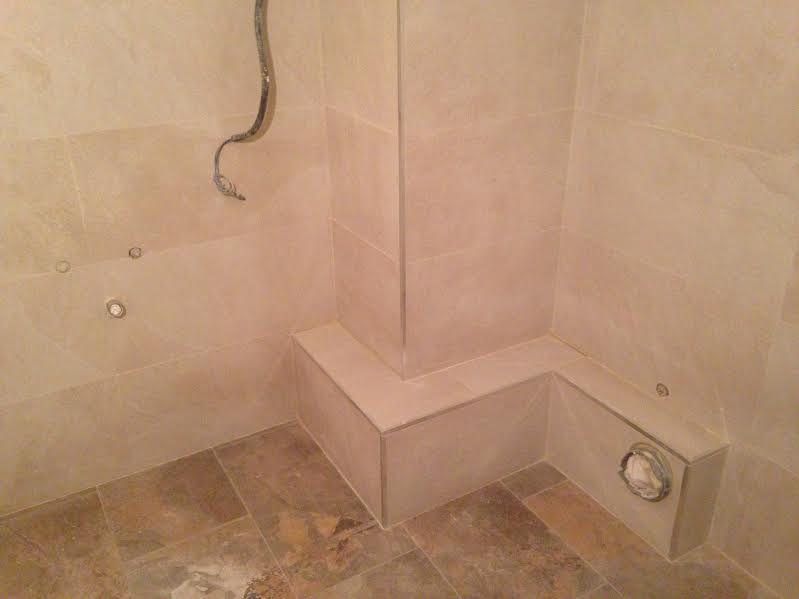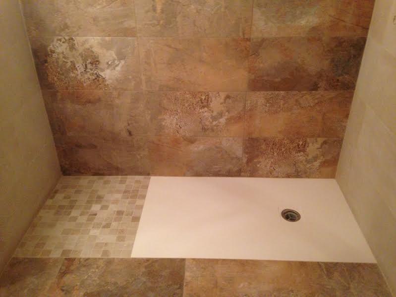 El siguiente paso es preparar la evacuación del plato y la base en todo el baño. Afortunadamente si que podemos poner el sifón de manera que enrasando el plato al nivel del suelo la evacuación sea la correcta . El plato que se coloca es de carga mineral (polvo de mármol mas resinas) con antideslizante grado 3 que es el máximo que hasta ahora se le puede dar y le realizamos una zona de secado con mallas de piedra natural a juego del suelo porcelánico.
