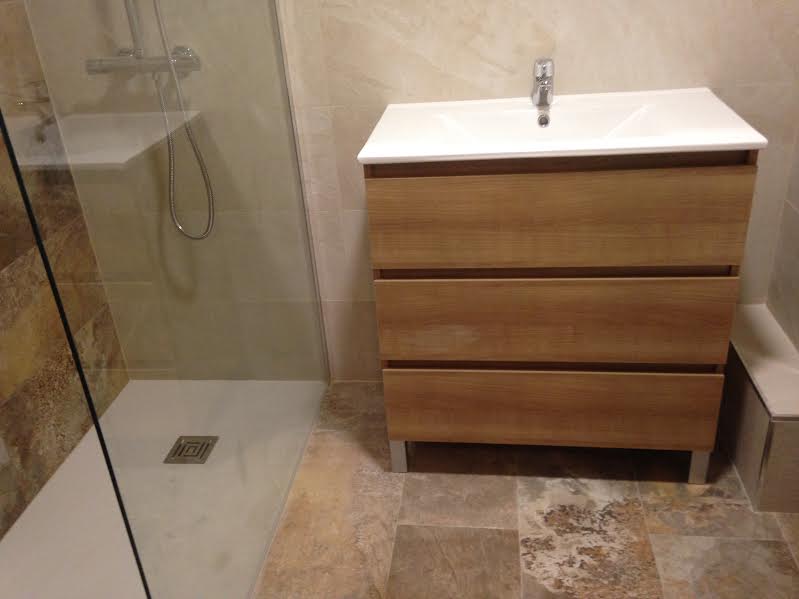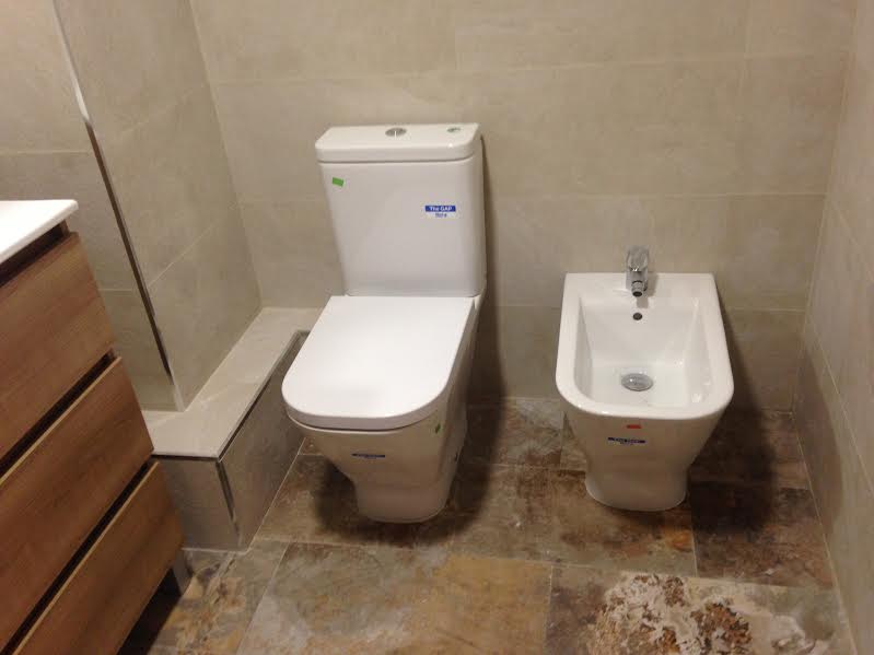 Se realiza la instalación del inodoro y bidé que en este caso es el The Gap de Roca. Instalamos también el mueble de baño completo y un fijo de ducha en cristal de cristal templado segurizado de 8 mm y tratamiento antical con su correspondiente brazo soporte en inox para el plato de ducha.