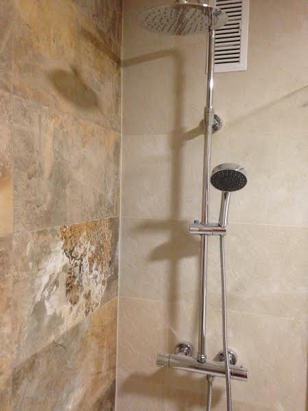También instalamos el conjunto de ducha termostático de alta gama. Para esta obra, hemos tenido el cuidado de respetar la escayola original ya que estaba en un perfecto estado y así hemos ahorrado en el presupuesto final. Los mecanismos elegidos son el Simon 27 en beige con embellecedor cromado.